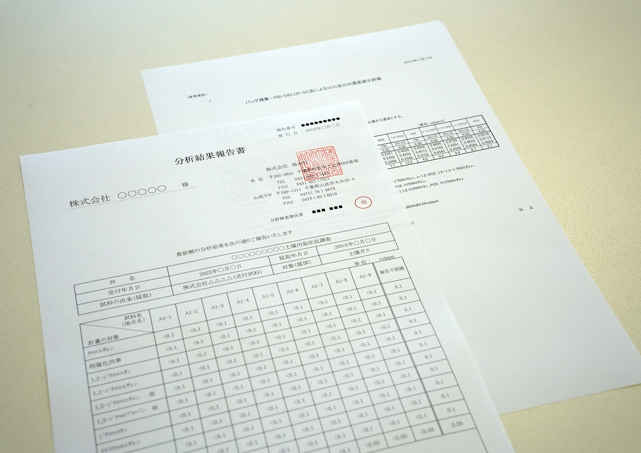 ●土壌ガス(現地分析) 分析終了後、現地にて結果一覧表をお渡しいたします。
